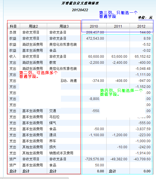 “会计信息”---》“自定义查询”很初步地实现了pivot查询,还需要再加上条件限制,以及改进顶
